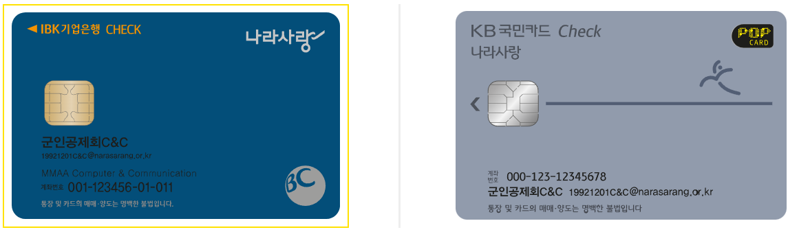 나라사랑카드는 국민은행과 기업은행에서 선택가능합니다. 아직 카드가 없으시다면 두 종류의 카드 혜택을 비교해 보시기 바랍니다.
