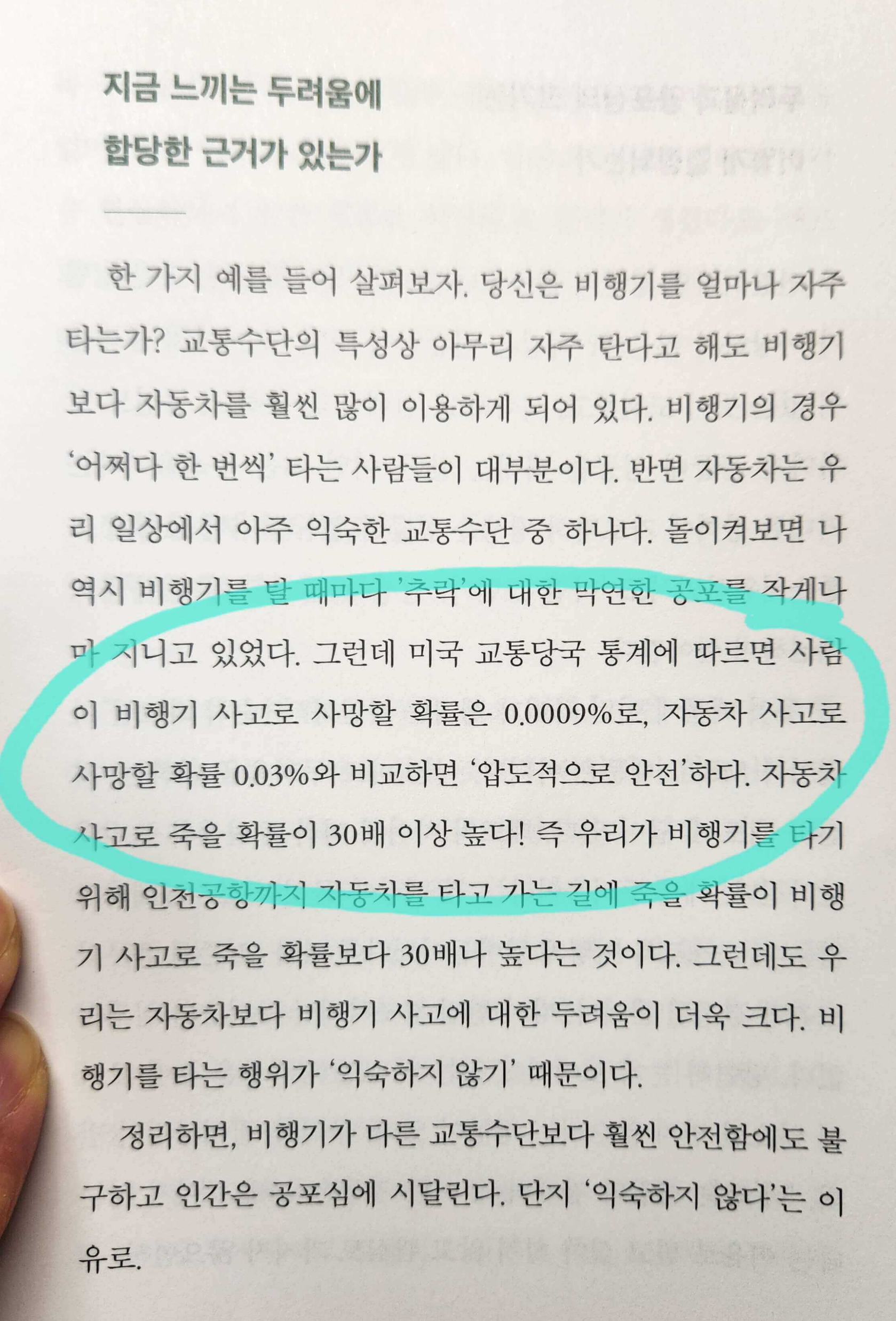 비행기 탑승이 두려운 사람은(저를 포함해서) 익숙하지 않은 것에 대한 막연한 공포를 이겨내야 합니다. 위에 소개한 책 페이지의 소제목 '지금 느끼는 두려움에 합당한 근거가 있는가'처럼 우리가 느끼는 막연한 공포가 진정 근거가 있는지 깊이 생각해 봅시다. 근거 없는 허상에 불과한 두려움에 자신을 혹사하고 있지는 않을까요.